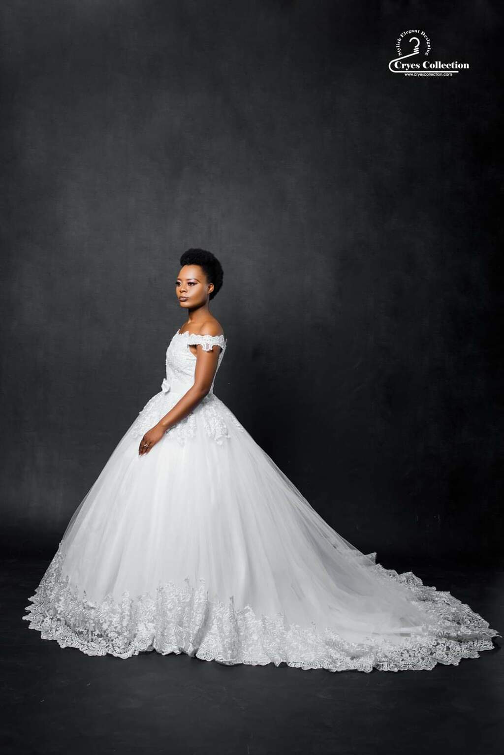 Off the shoulder ball gown with edging lace.