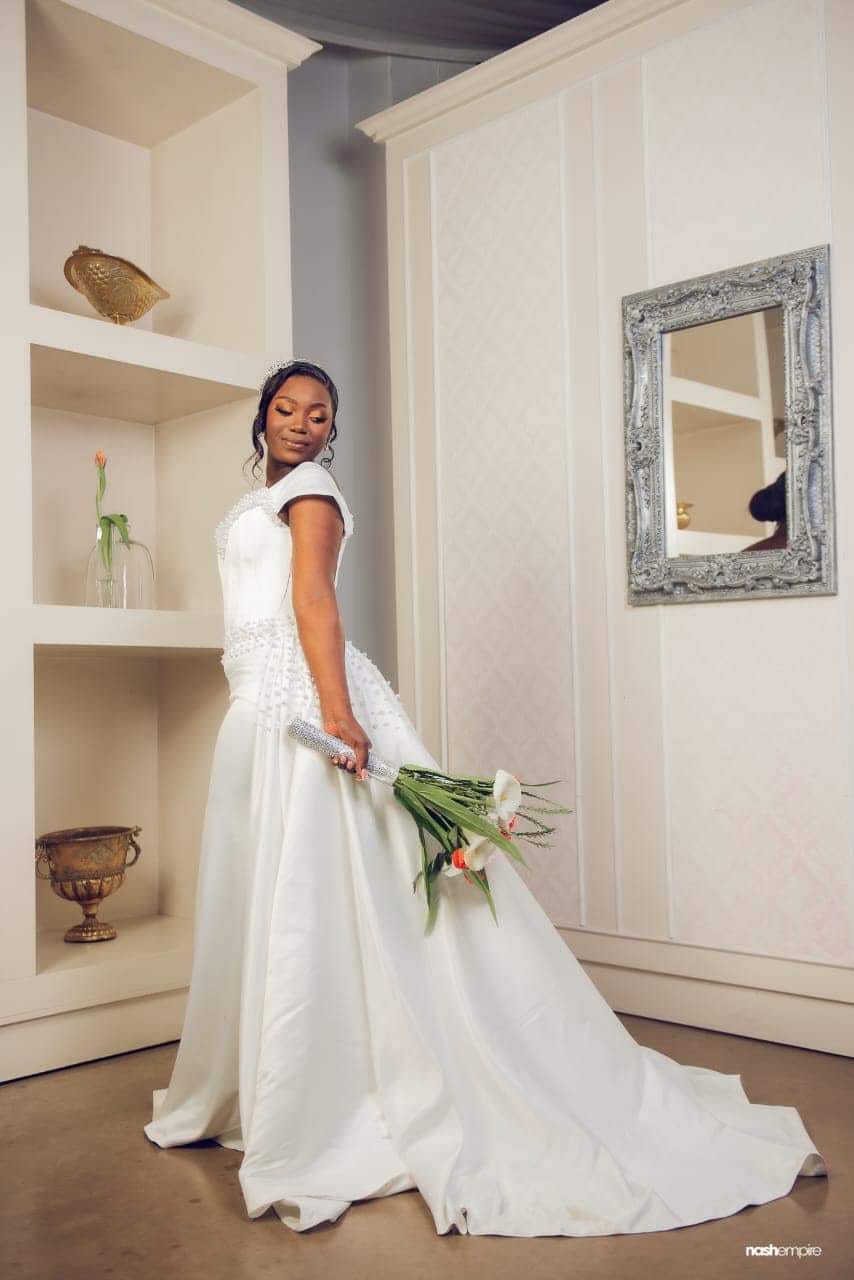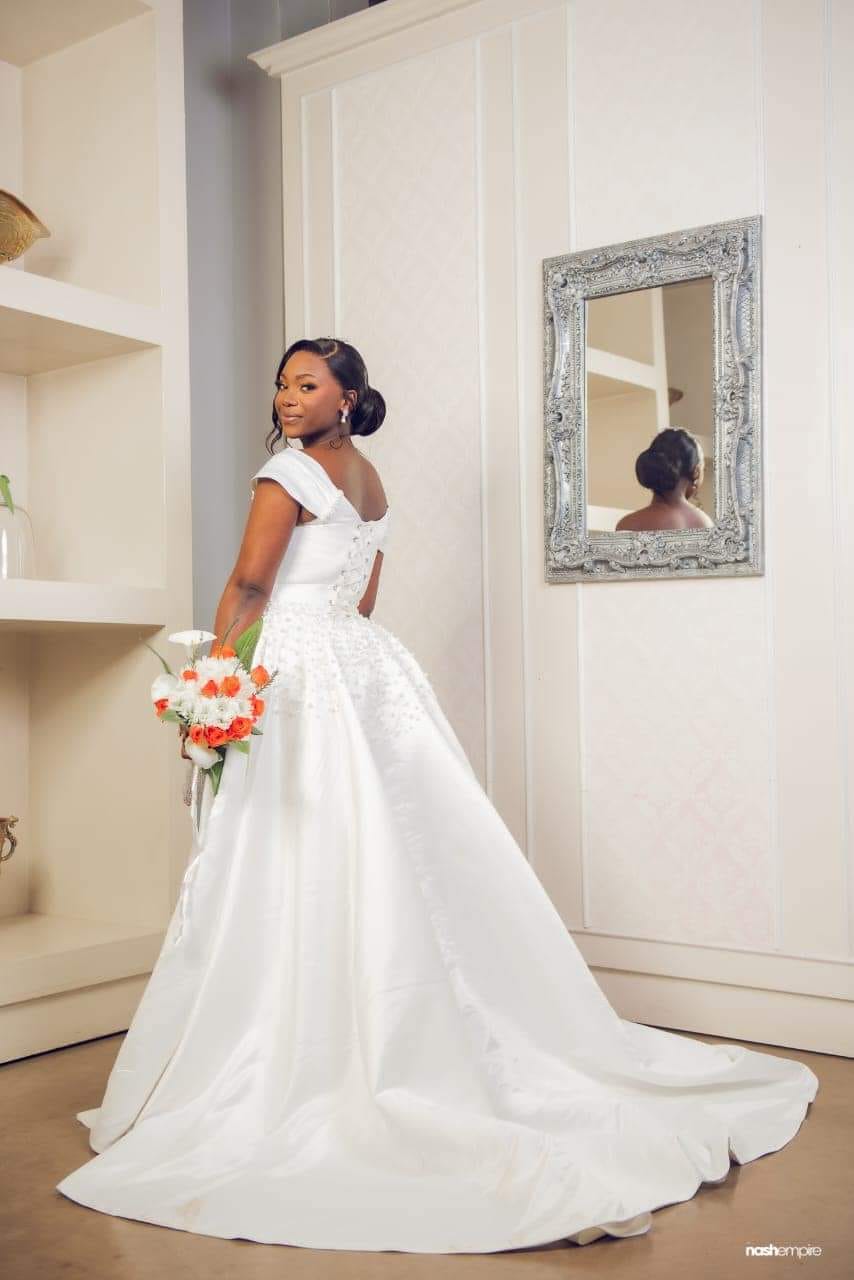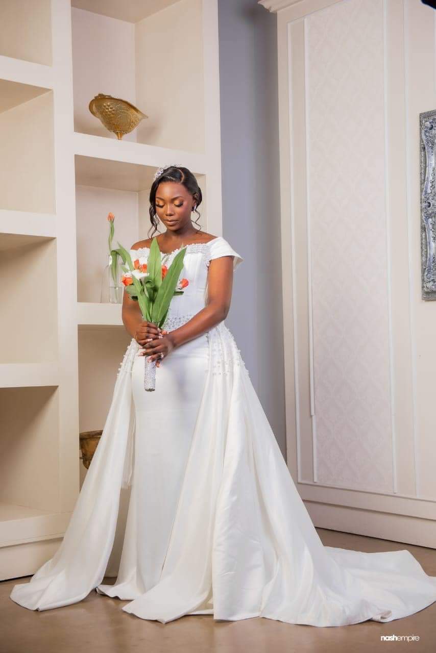 Off the shoulder, corset beaded wedding gown with a back tail.